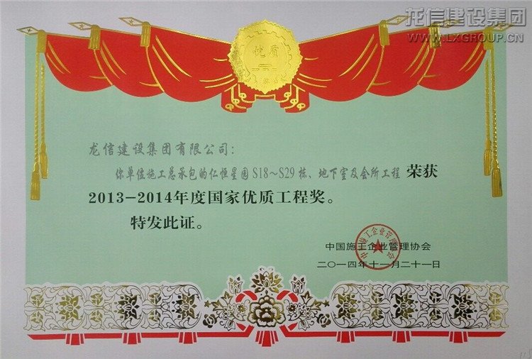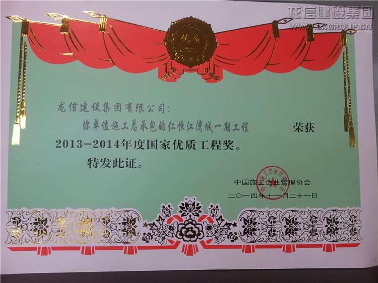 近日公司承建的“仁恒星園S18~S29棟、地下室及會所”、“仁恒江灣城一期工程”喜獲2013-2014年度“國家優(yōu)質(zhì)工程獎(jiǎng)”,子公司江蘇紫浪裝飾裝璜有限公司承建的海門市東恒盛國際大酒店裝飾工程獲“2013-2014年度全國建筑工程裝飾獎(jiǎng)”。