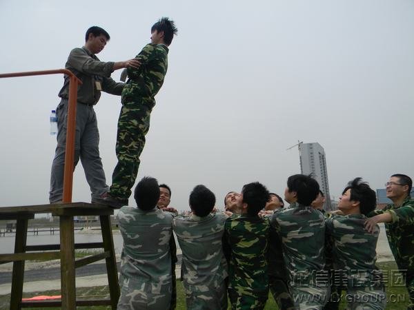 在做“高臺(tái)背摔”拓展訓(xùn)練時(shí),隊(duì)員們協(xié)同配合,親密無間,增進(jìn)了對(duì)團(tuán)隊(duì)的信任。
