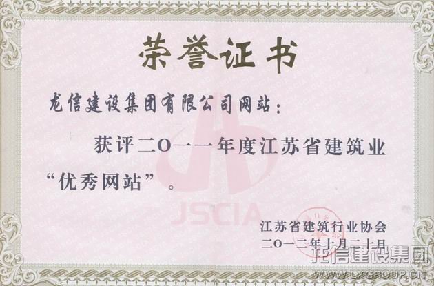 江蘇省建筑行業(yè)協(xié)會舉辦的2011年度江蘇省建筑業(yè)優(yōu)秀報、刊、網(wǎng)和優(yōu)秀通訊員評選活動,我公司《龍信》雜志和公司網(wǎng)站參加評選,其中《龍信》雜志被評為江蘇省建筑業(yè)十佳期刊,公司網(wǎng)站被評為江蘇省建筑業(yè)優(yōu)秀網(wǎng)站。