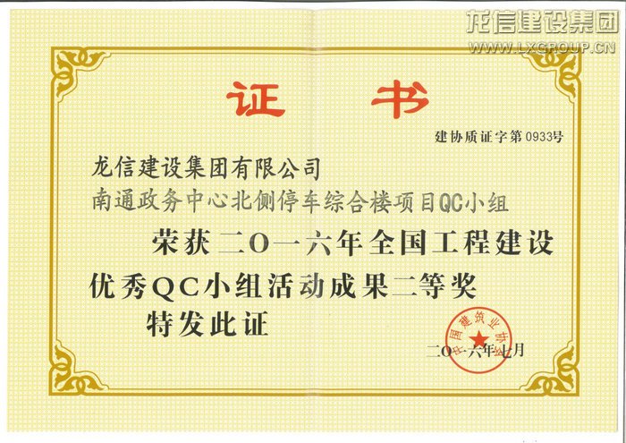 龍信集團的“龍信廣場QC小組”和“南通政務中心北側停車綜合樓項目QC小組”兩個企業(yè)優(yōu)秀QC小組喜獲全國工程建設優(yōu)秀QC小組二等獎。