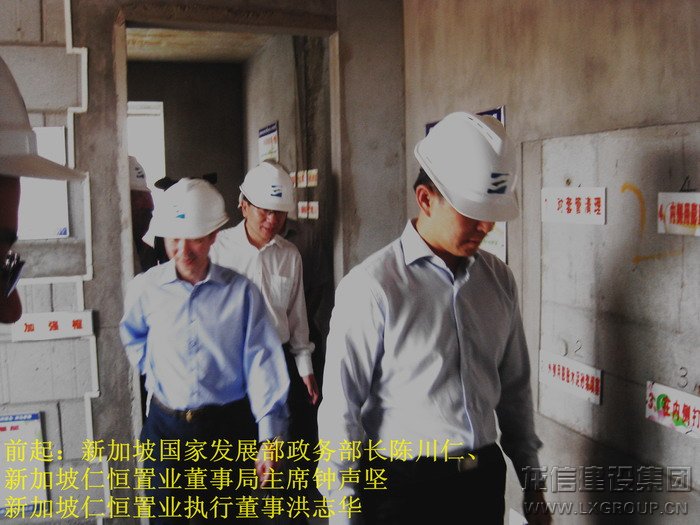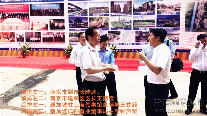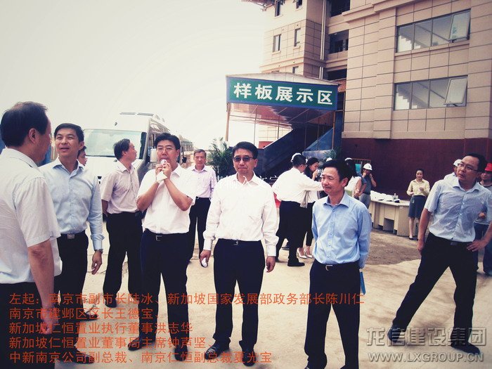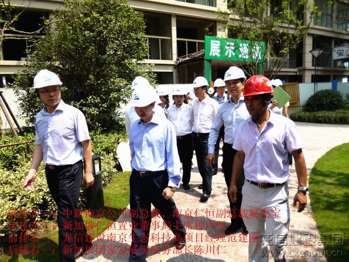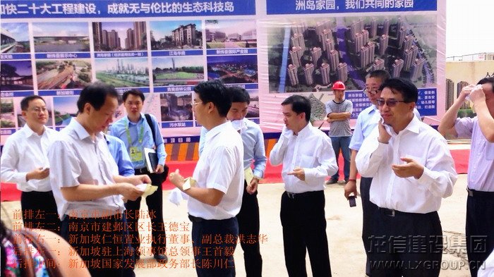 2013年8月16日上午,中、新領導考察團蒞臨江心洲在建項目南京生態(tài)科技島參觀考察,考察團由新加坡領導人力部代部長兼國家發(fā)展部政務部長陳川仁、駐華大使羅嘉良、駐滬領事館總領事王首毅、駐滬領事館領事陳櫘伊、國際企業(yè)發(fā)展局中國華東區(qū)副司長王俐恩、仁恒置業(yè)董事局主席鐘聲堅、勝科城鎮(zhèn)發(fā)展有限公司總裁趙萬成、仁恒置業(yè)執(zhí)行董事執(zhí)行副總裁洪志華,中方南京市副市長陸冰、南京市建鄴區(qū)區(qū)長王德寶、中新南京公司副總裁南京仁恒副總裁夏光寶、馮亞軍、張俊、王杰等其他領導組成,龍信建設集團江心洲項目經(jīng)理范建剛全程陪同。